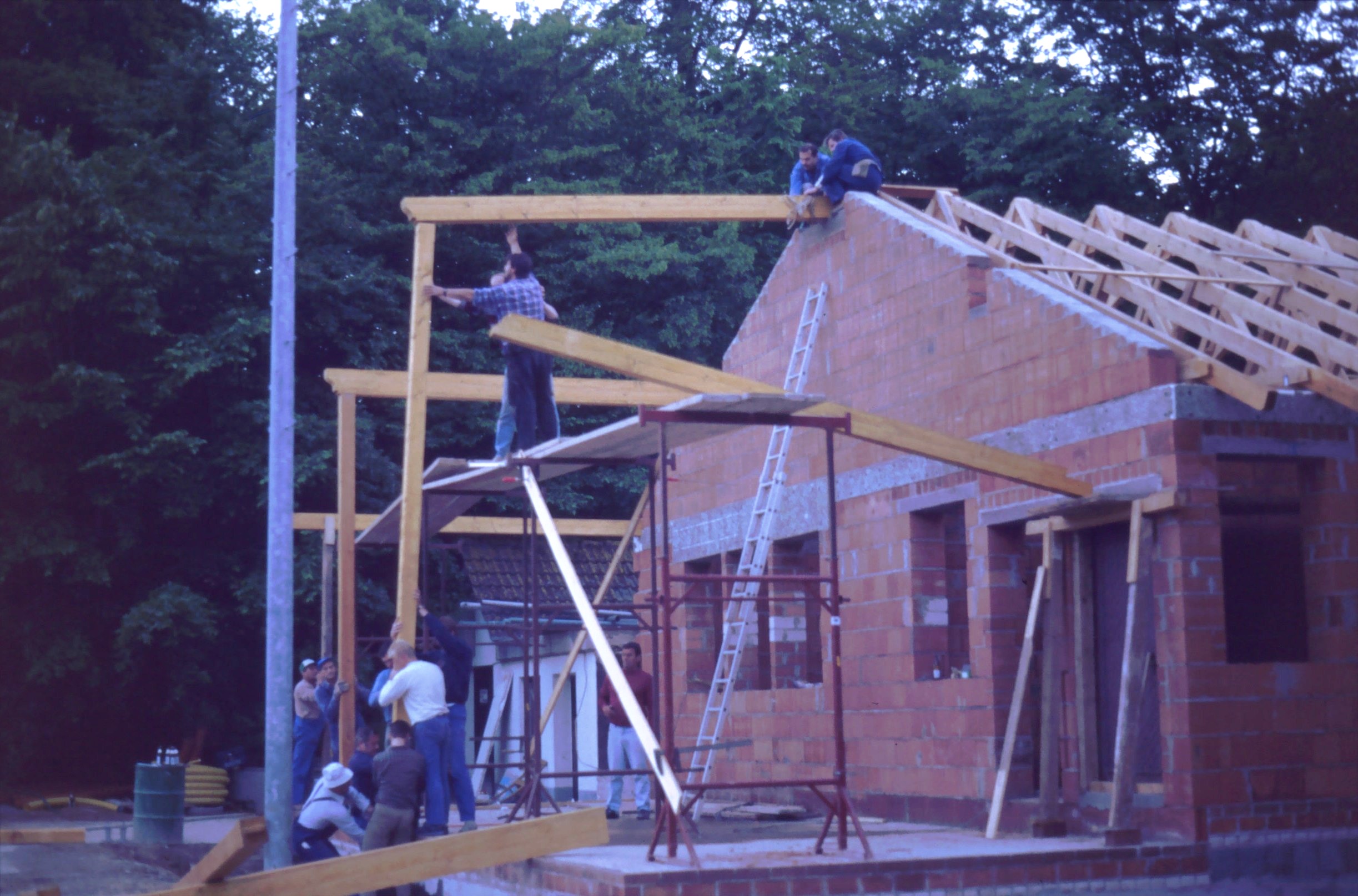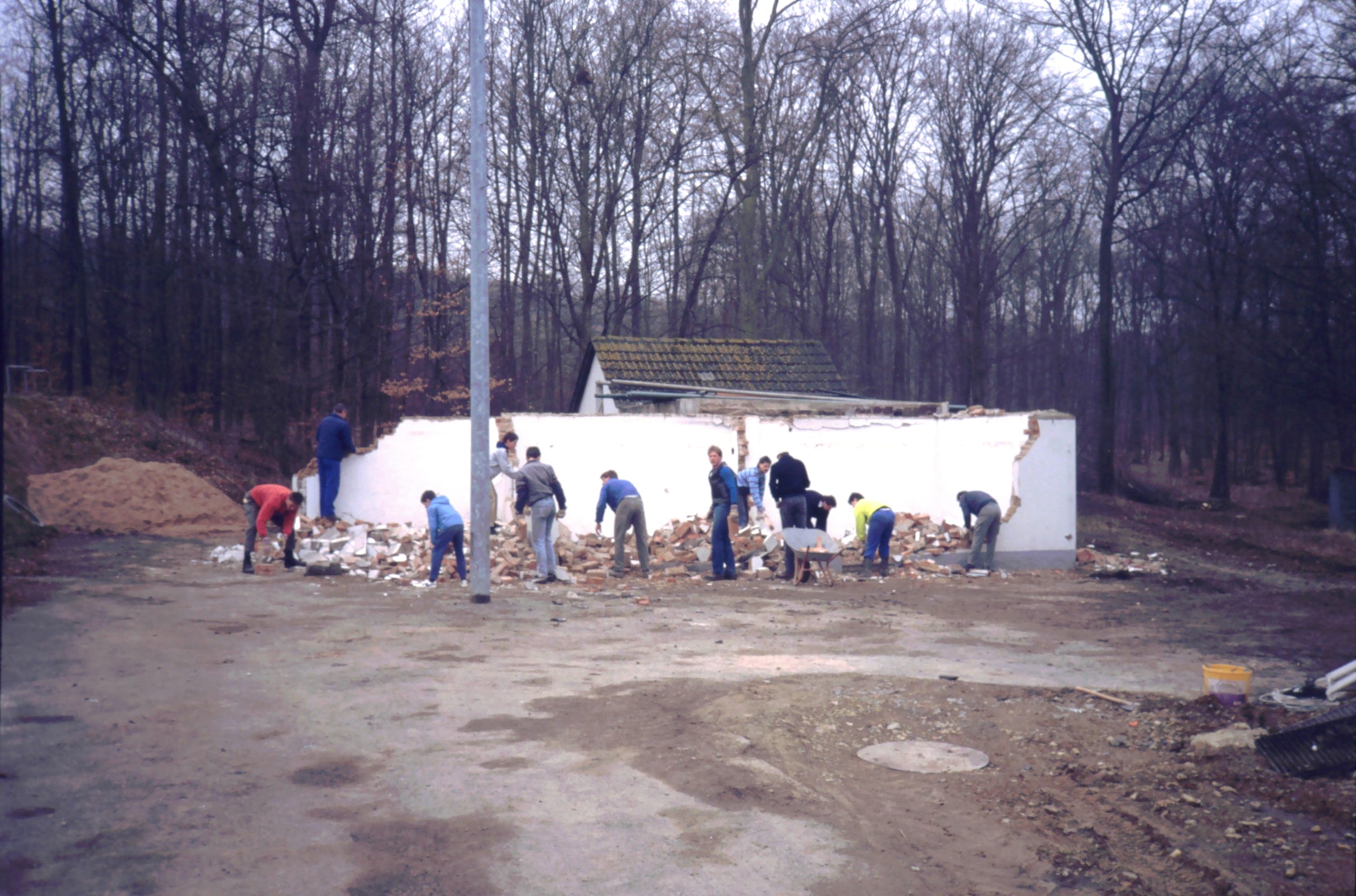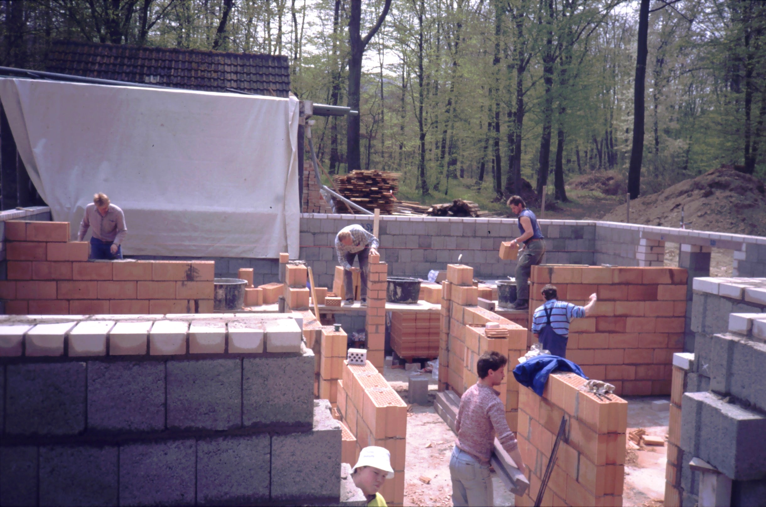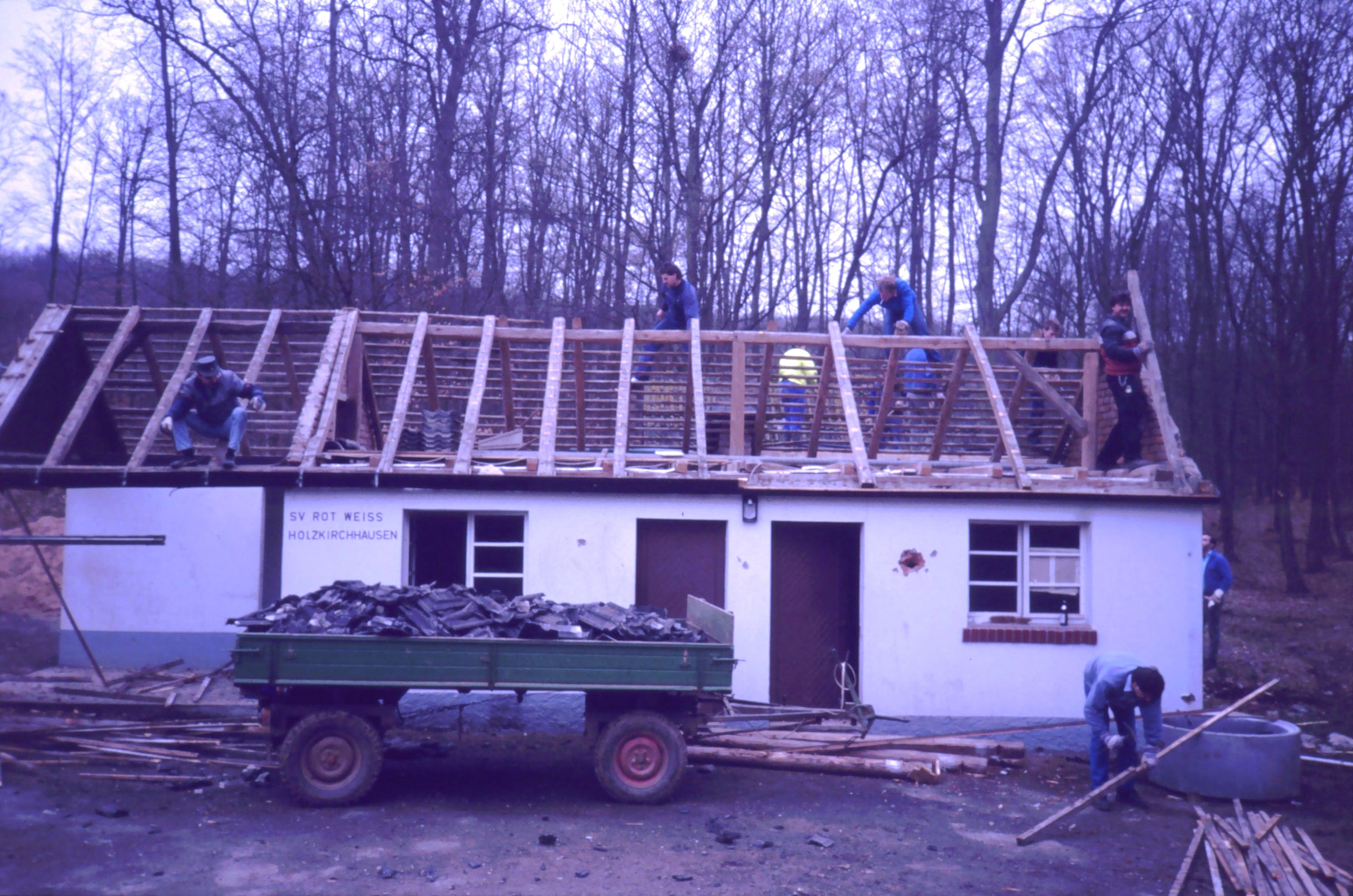 Begonnen wurde mit dem Abbruch des alten Häuschens, das über einem Zeitraum von über vierzig Jahren Jung und Alt in schönsten Feierstunden beherbergt hatte, im Januar 1991. Der eigentliche Baubeginn mit dem Aushub des Kellergeschosses war der 22. März 1991. Der Rohbau war Mitte des Jahres so weit abgeschlossen, so dass die Innenausbauarbeiten aufgenommen werden konnten. Bis Mitte des Jahres 1992 waren die Arbeiten bis auf den Außenputz und sonstigen Kleinigkeiten beendet und die hilfsbereiten Mitglieder hatten ca. 10.000 Arbeitsstunden jeglicher Art erbracht.